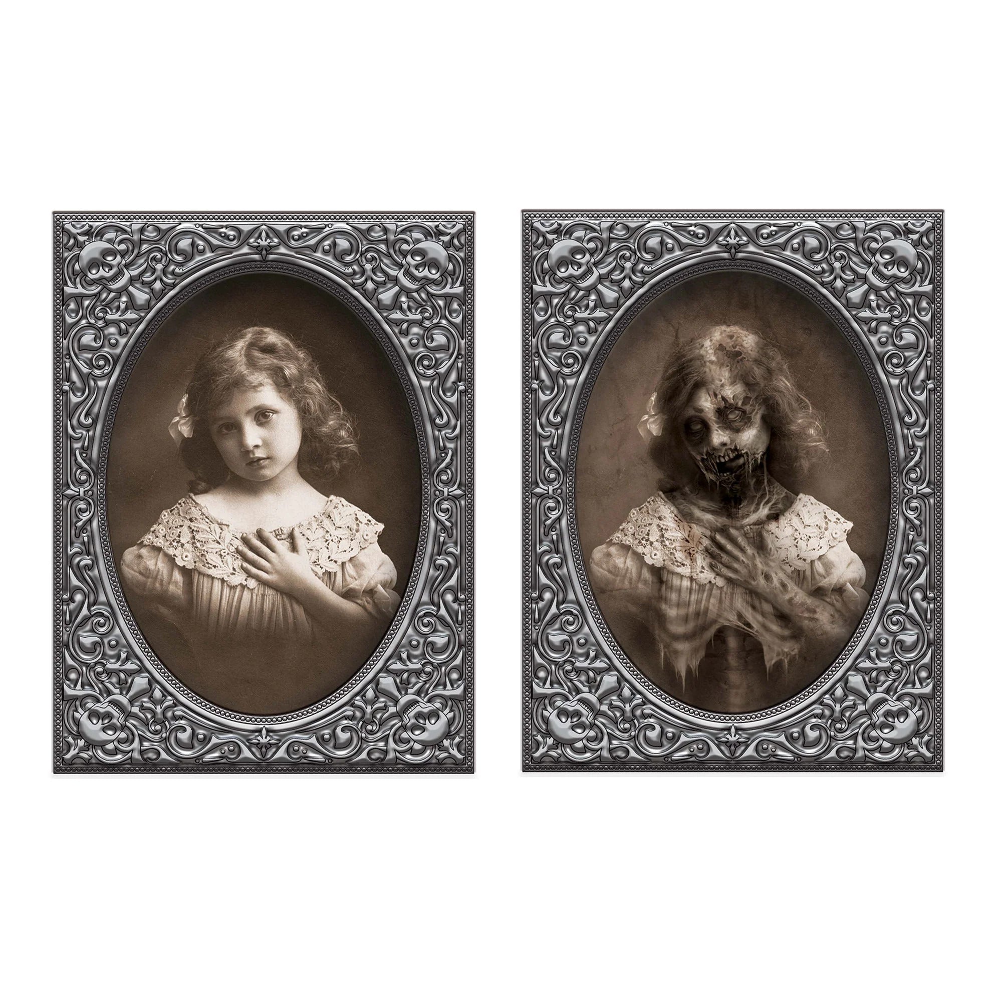 Creep everyone out with haunting photography when you decorate your own gothic mansion hallway. Try adding this Halloween Lenticular Decoration to your party decoration that features a little girl lenticular decoration that flickers into a rotting zombie. Its lenticular design shows different pictures at different angles. Simple use the attached easel to place this photo on choice locations so you can scare your guests!