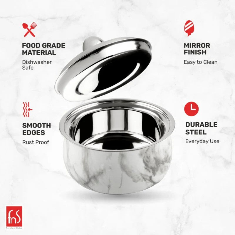 This Casserole is a quality product by FNS. Ideal storing veg biryani, pulav, chapati, noodles, pasta, dal, soup or any liquid. Easy to carry from kitchen to dining table. An eye catching design. Mirror finish, Long Lasting, safe for storing food for long hours, rustproof material. Its double wall make this product insulated that can keep your food hot /Cold for a long period. Easy to clean. Made from Premium stainless steel.