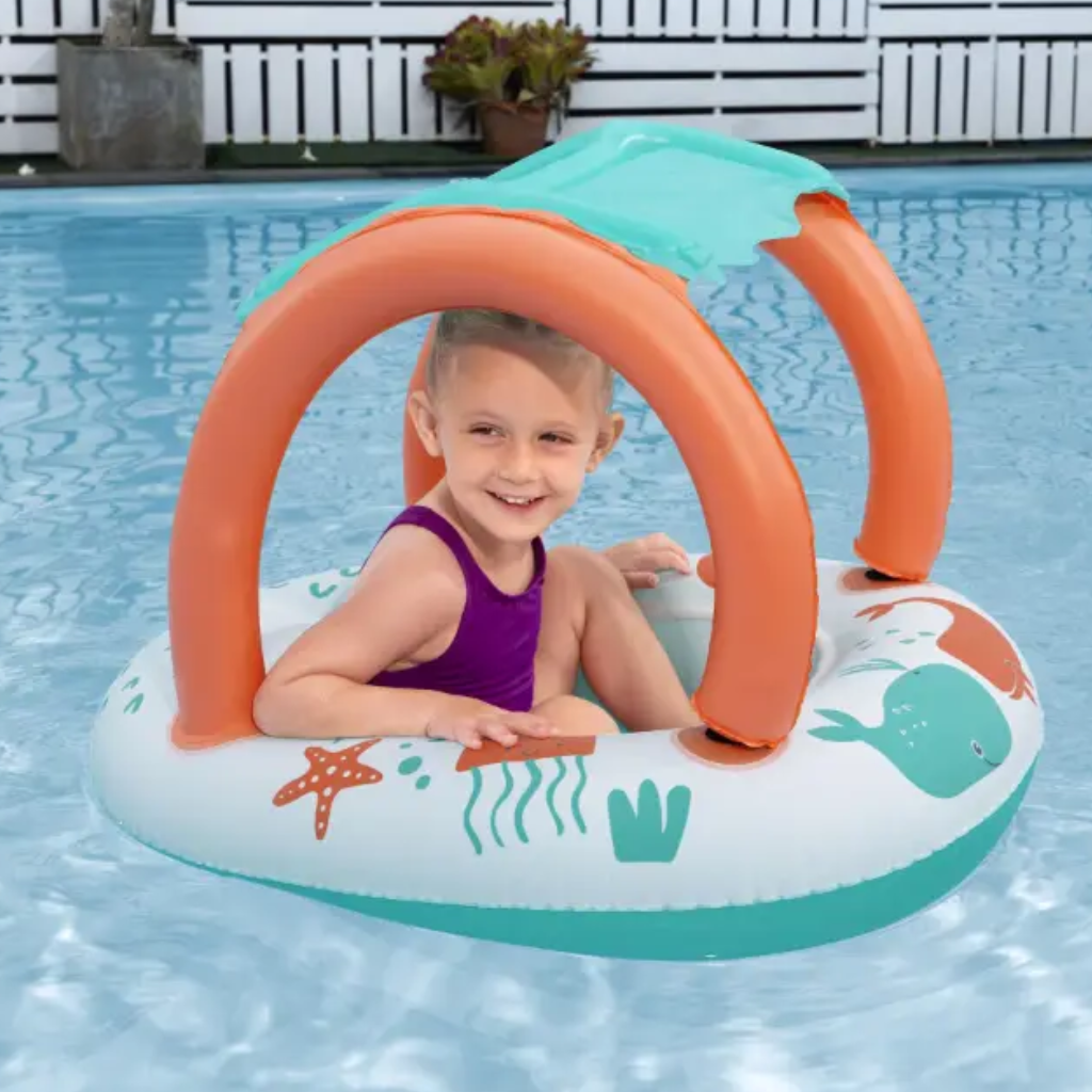 Soak up fun times and some of your little ones first pool experiences with the Bestway© Comfort Plush? Shaded Inflatable Baby Boat. Featuring smooth and soft Comfort Plush velvety material, this baby boat would not stick to your childs skin and would not get too hot under the sun making it the perfect accessory for a warm day at the pool!