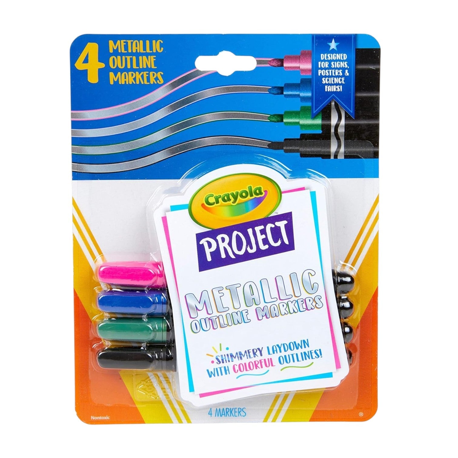 From the Crayola Project Line, Metallic Outline Markers feature a unique lay down that display 2 colors with one stroke! When applied to poster or foam board the ink naturally separates and creates a beautiful outlining detail. These fun markers let you add special effects to art projects, crafts, homework assignments, and more! Includes 4 metallic markers that work well on both light and dark surfaces, with varying outline effects on dark surfaces. Included colors are Black, Green, Blue, and Pink. Pair with Crayola Project XL Markers (sold separately) to make your school projects pop!