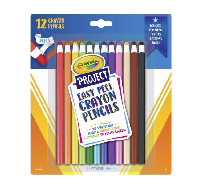 From the Crayola Project line, Easy Peel Crayon Pencils are designed with quick-dry technology and easy peel barrels so that sharpening is never needed! Just peel away layers to expose the color core. Easy Peel Crayon Pencils provide vibrant color coverage and work great on a variety of surfaces. Colors are easily washed from skin and most washable clothing. Includes 12 Washable Crayon Pencils in assorted colors. Ideal for kids, ages 6 and up.