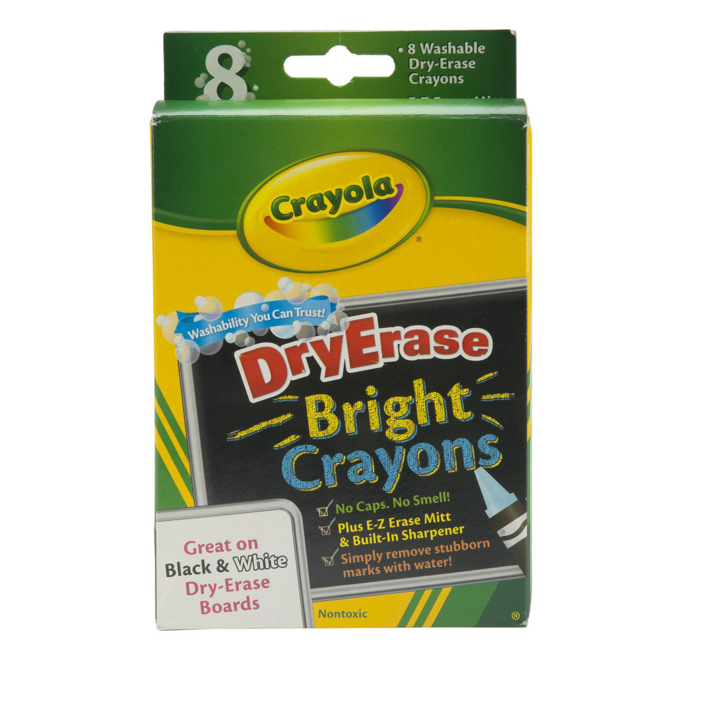 Odorless, washable dry-erase crayons give kids a fun new medium for creative expression, without worries over lost caps. Crayons easily erase from wipe-off surfaces and wash cleanly from hands and clothes. This handy pack of dry-erase crayons comes with a built-in sharpener and EZ-Erase mitt eraser that is machine-washable. The Bright Color variety expands kids' creativity options, and colors show up bright and vibrant against dark or white dry-erase surface.