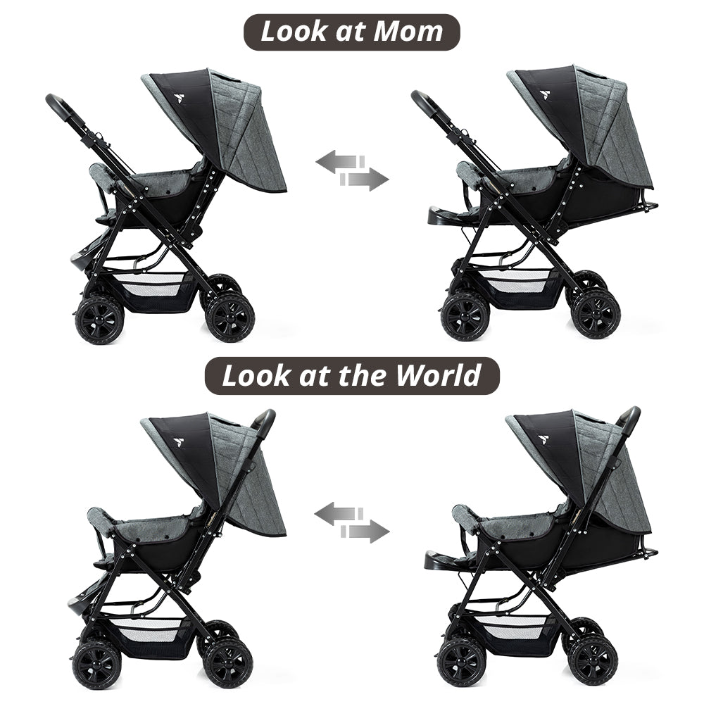 Teknum Look At Me Reversible Stroller by SAMBOX is a perfect choice for a Robust Reversible Stroller. The handle can be easily adjusted to the view for baby looking at the mom or baby looking at the world! This Stroller is so smooth to ride and slim to pass though the standard gates. The seat can be inclined flat to let the baby sleep comfortably. Made of linen and cushioned seats provide absolute comfort for your little one. A Big Cart basket is enough to carry a lot of items. Front wheels have smooth swivel and foot activated locks. The Canopy have a transparent peek - a - boo window for the baby to feel comfortable. It's single hand folding system with easy storage while travelling.