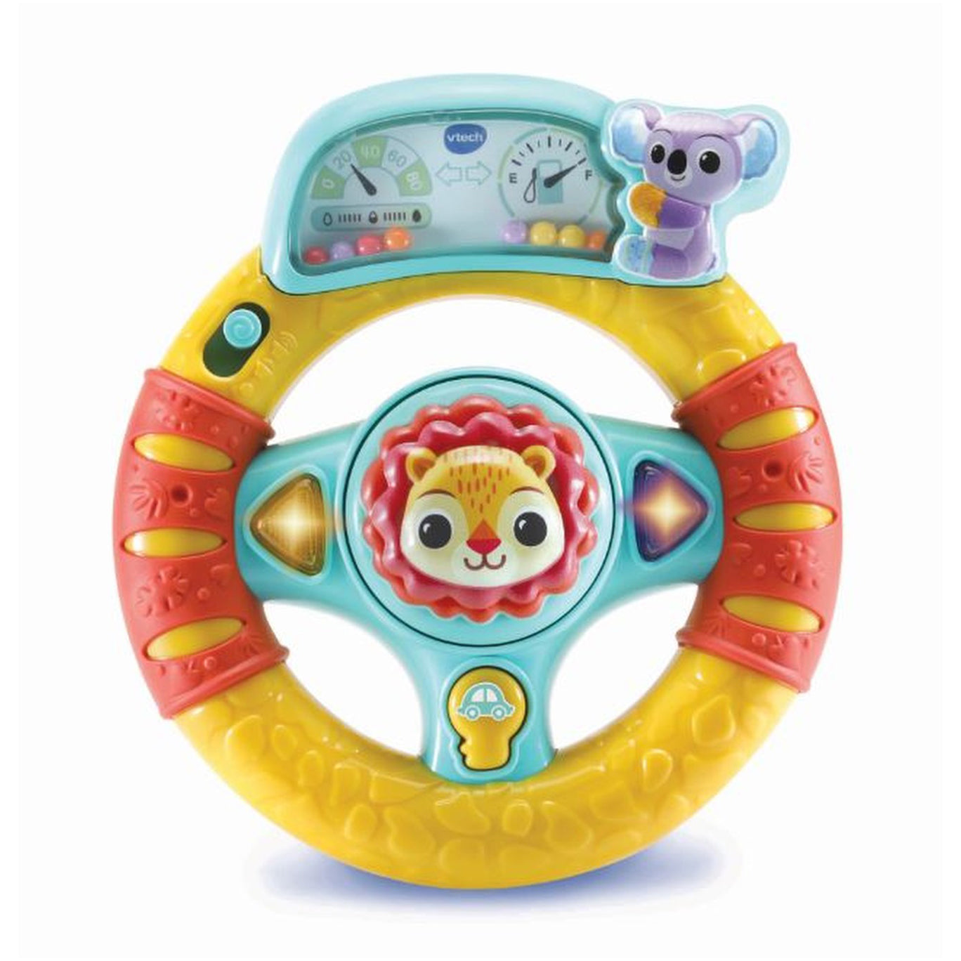 Little ones take the wheel and explore with the Roar & Explore Wheel. The interactive lion drives the fun with music, car sounds, colors and lights. Press the friendly lion's face and steering wheel buttons to hear 45+ songs, melodies, sounds and phrases. Turn the motion-activated steering wheel to play silly sounds and melodies and watch the beads roll as the wheel moves. Grabbing and exploring the rubbery hand grips and bumpy steering wheel helps babies and toddlers develop their fine motor skills. Kids love to imitate their favourite adults, and this educational toy lets them pretend to drive as they go along on walks, errands and road trips. The signal lights flash just like a real car's as they play tunes and sound effects. Press the car button to hear driving phrases and engine sounds. Steer little ones toward learning! Attaches to strollers and infant carriers with hook-and-loop strap