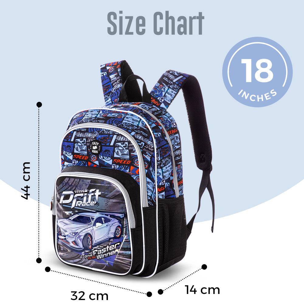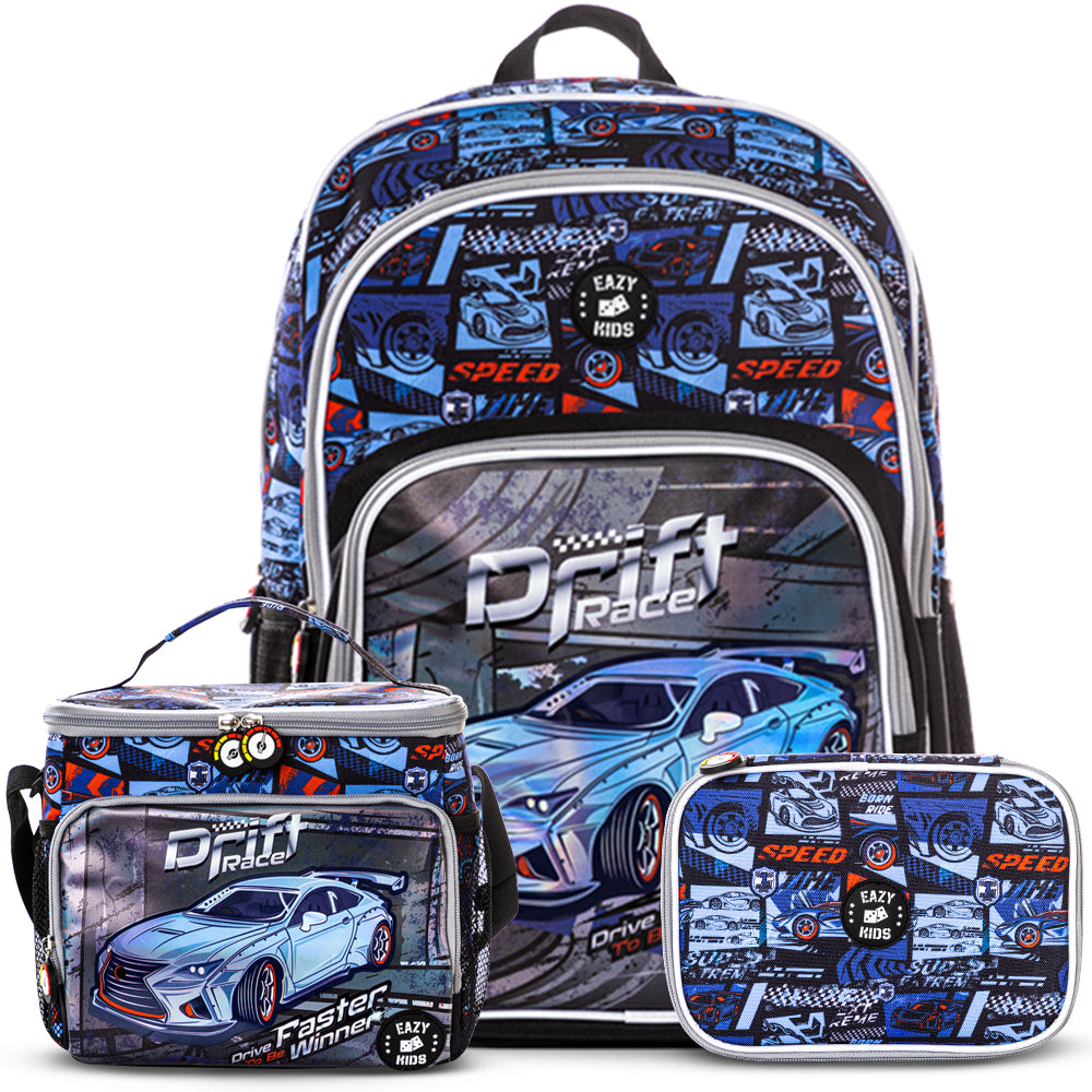 Get your little one school-ready with the Eazy Kids Back to School Set of 3 – Car Racing! This stylish and practical set includes an 18-inch backpack, an insulated lunch bag, and a spacious pencil case, all designed to keep school essentials neatly organized. The backpack features multiple compartments, including a dedicated laptop pocket (fits up to 14 inches), a front zipper pocket, and two side pockets for bottles or snacks. With adjustable, padded shoulder straps and a cushioned back panel, it ensures all-day comfort, while the trolley-compatible design with buckle locks adds extra convenience.