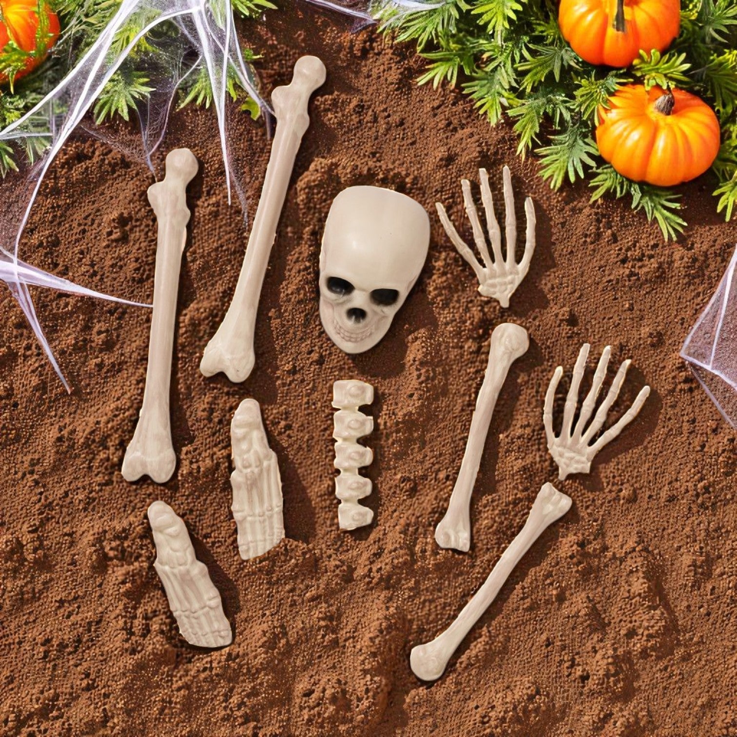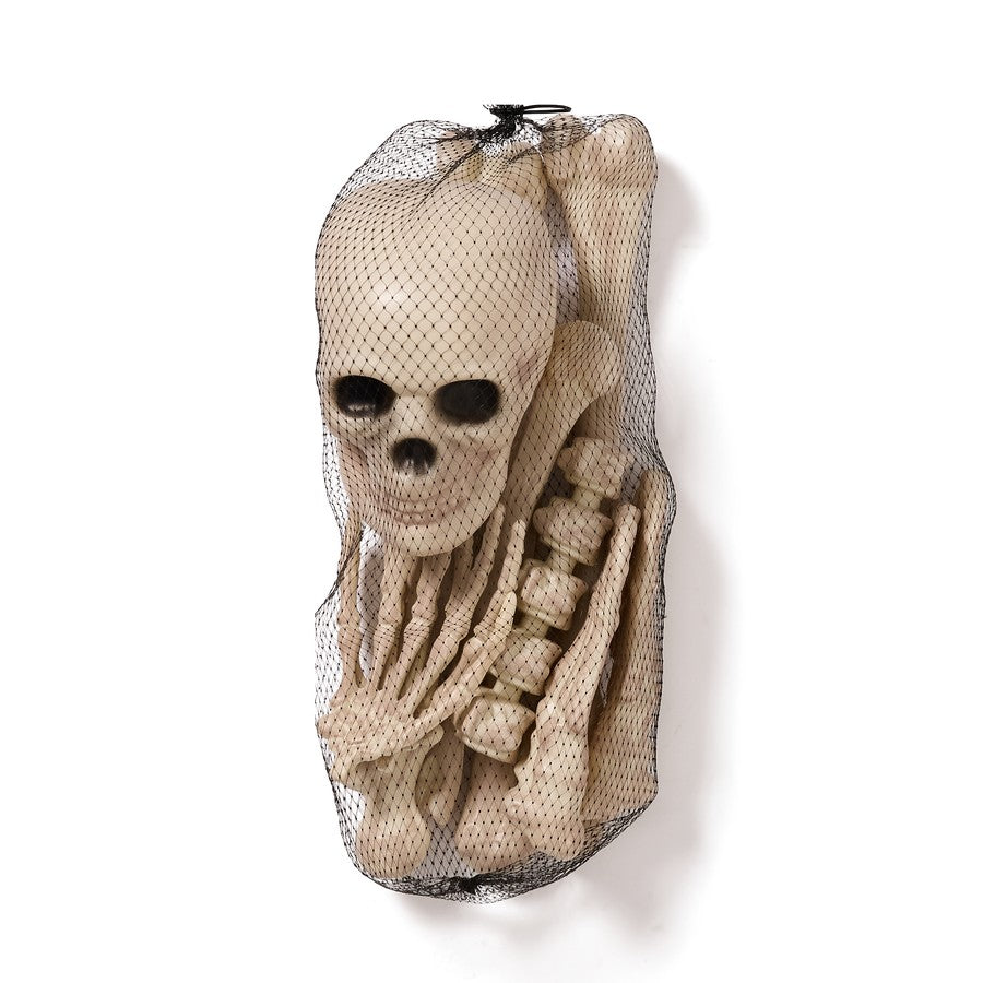 This is a realistic plastic bone set that comes in a mesh bag. It is made from weather-resistant plastic suitable for both indoor and outdoor use.