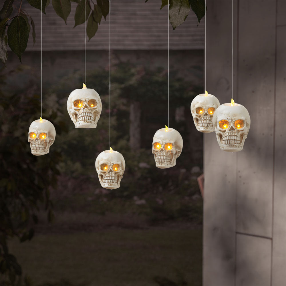 The mini skulls dangle from thin white strings attached to a single cord that you can hang anywhere you like indoors or outdoors. The yellow lights inside their eyes give off a warm yet earie glow.