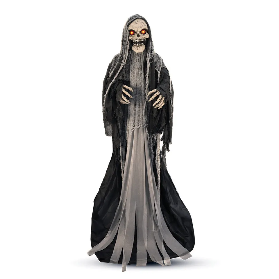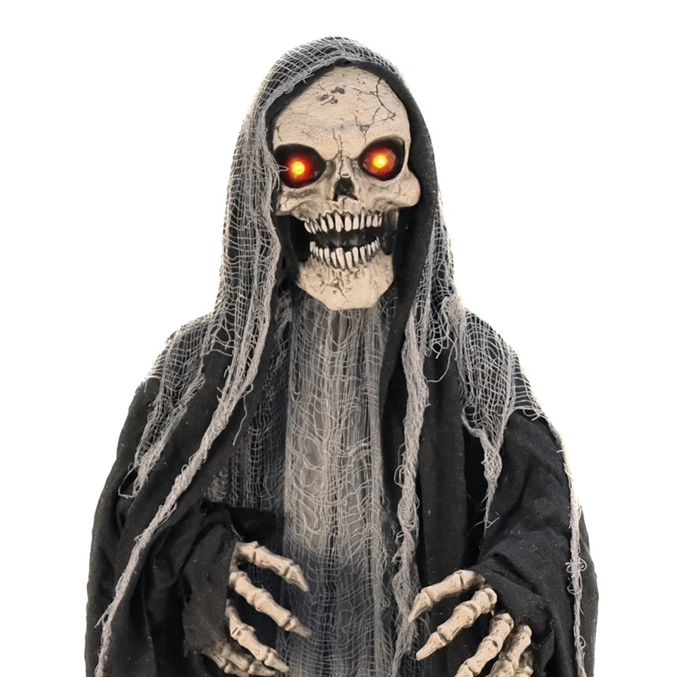 -Chilling Details: Features a skeleton face and hands, a black and grey cloak, and glowing eyes for an eerie effect.