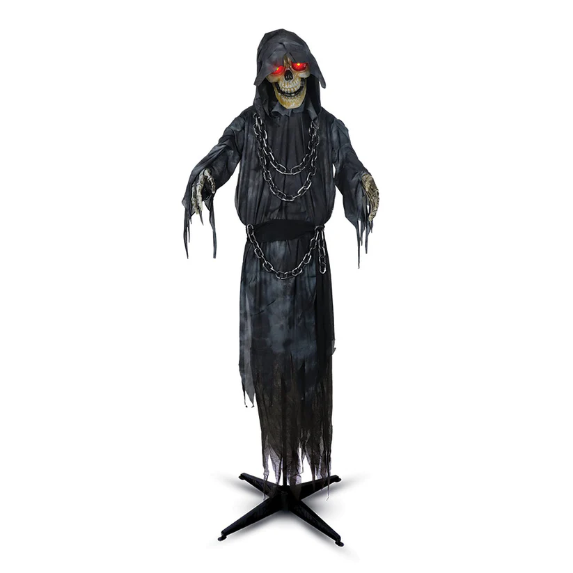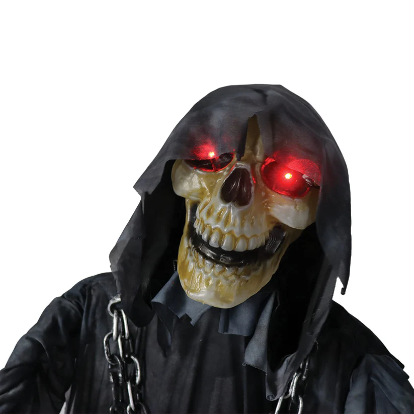 s darkness envelops the night, the 5 Feet 7 Inches Standing Reaper with Chain emerges from the shadows. With its haunting skeleton face, glowing eyes, and sinister grin, this reaper stands tall in its black cloak, clutching a chain as if bound by ancient curses. When activated, its eerie lights and chilling sounds bring the reaper to life, sending shivers through all who approach.
