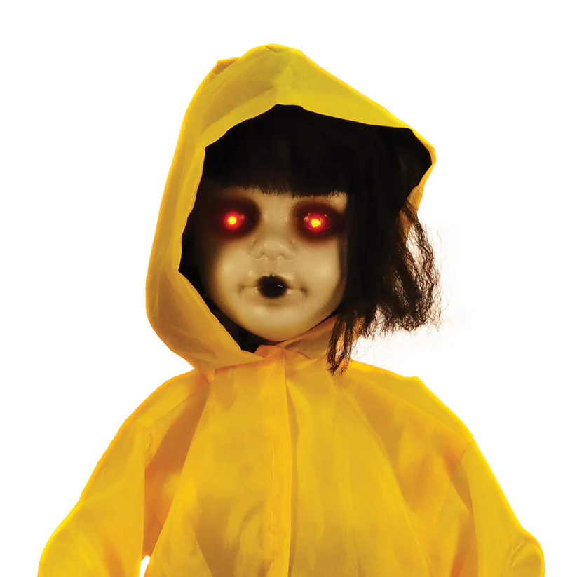 -Hauntingly Realistic: The yellow raincoat, brittle black hair, and big brown shoes create a disturbingly lifelike appearance inspired by the "It" movie. The creepy child also nods its head with a motion-sensor detection.