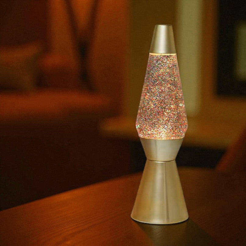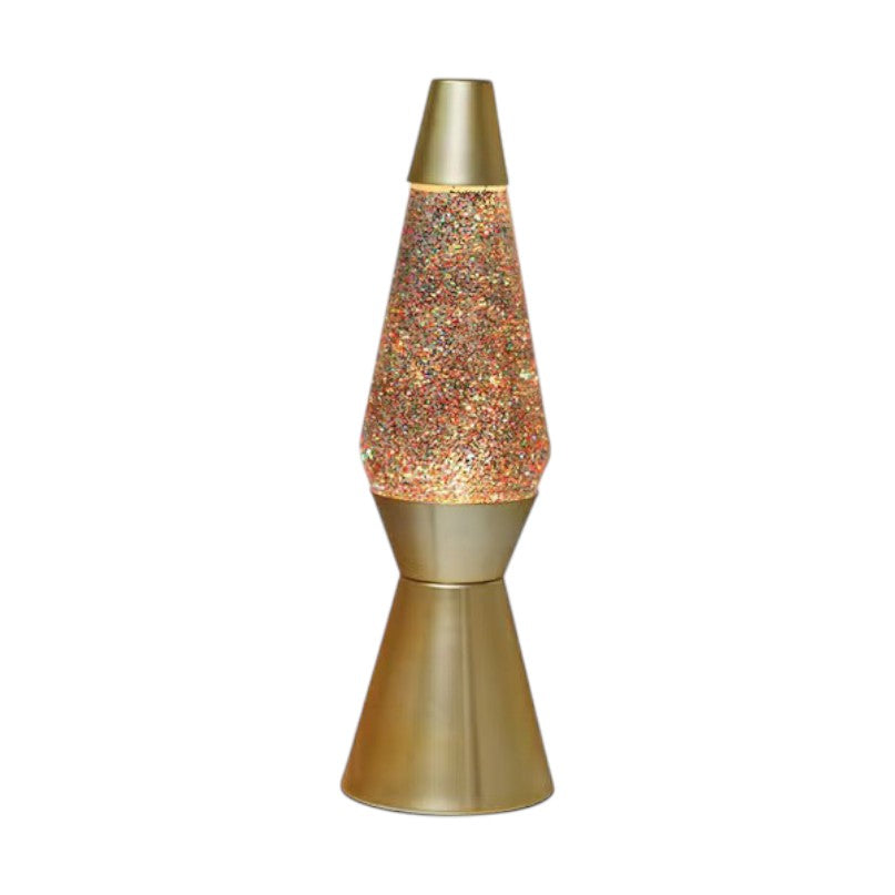 Lava lamp GOLD GLITTER 40 centimeters long. With beautiful golden glitter, a cord of 160cm long and 1 light bulb (30W) included.