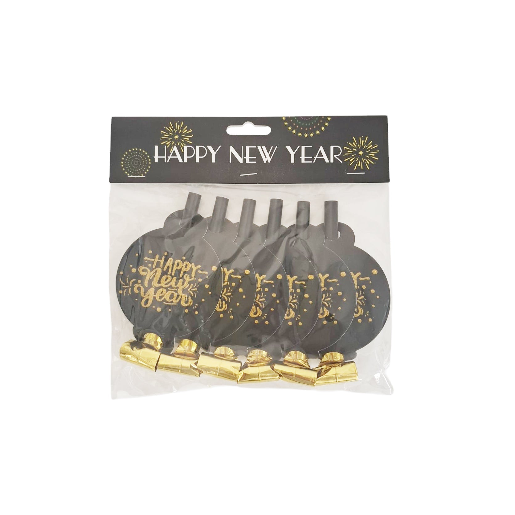 Happy New Year Black & Gold Blowers - 6pcs Set