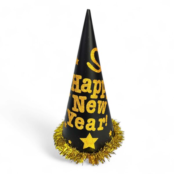 Happy New Year Cone Hat- Black with Glitter Large